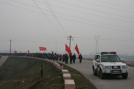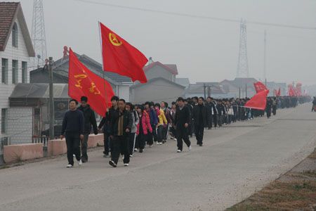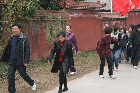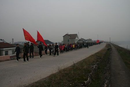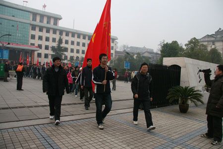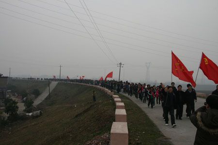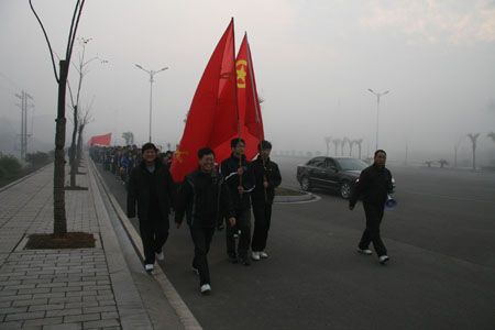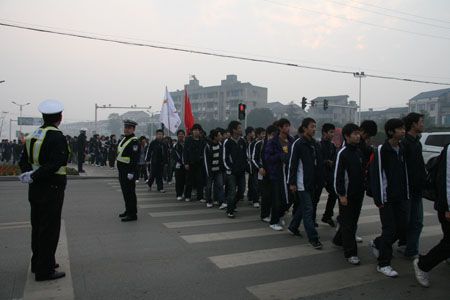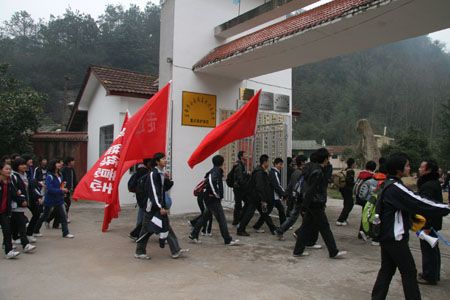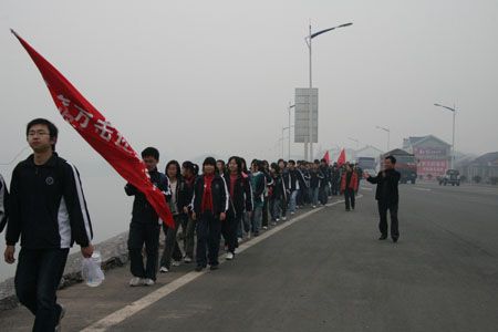 12月29日上午8:00,经过简短的启动仪式后,远足活动正式开始。周校长与学校行政干部以身作则,走在队伍的最前列,紧随其后的是高二年级全体师生1000余人,随行的还有特邀学生家长、东风社区的同志们。同学们着装整齐,兴致勃勃,精神抖擞,行军路上彩旗飘飘,口号嘹亮,队伍严整,引来无数市民的驻足观看和称赞。历经近4小时的漫长跋涉,上午11:40终于到达我校德育教育基地——宋山。经过短暂的休整后,同学们观看了禁毒图片展和交通安全图片展。下午1:00集合队伍原路返回。