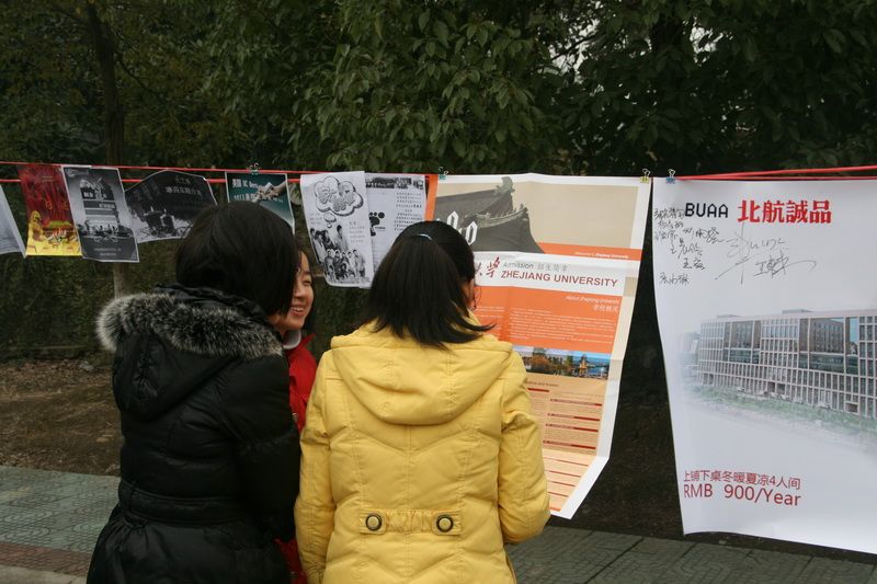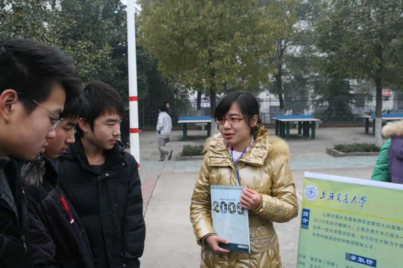 中午是“重头戏”咨询会,在紫竹苑食堂对面篮球场,在缤纷的大学社团海报前,早已就位的毕业学子们摆开阵势,用各种方式,为自己的大学制造声势。上海交通大学的展位格外显眼,2010届毕业生邓昊和李雯文联系到了2008届的学长学姐来助阵,各种宣传资料令学弟学妹们感到耳目一新。清华大学与北京大学展位由于有高考状元坐镇,实力最为强大,展位前聚集起了很多讨教学习方法的同学。而对外经济贸易大学展位则动用了多媒体手段,摆开笔记本播放起了学校宣传视频,5位在场的贸大学生也扯开了嗓子为大学做着宣传,他们的热情更体现在手绘的贸大校徽上。浙江大学则拉来了帅哥学长谭俊同学,吸引了不少的同学前往咨询,人气爆棚。一时间两个篮球场上站满了咨询参观的学生,2010届毕业生是我校至今最辉煌的一届毕业生,他们的能力也体现在和一中在校生的交流上,他们营造了亲切的氛围,耐心的解答他们的各种问题,为他们的学习出谋划策,很多一中学生的脸上露出了满意的笑容。一小时很快就过去了,但是很多同学都还意犹未尽,与学长学姐聊得非常投机,在老师的催促下才不舍地离开咨询会场。咨询会后,2010届毕业生们亲切地合影一张,庆祝这一阶段性成功。
