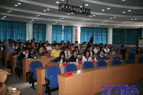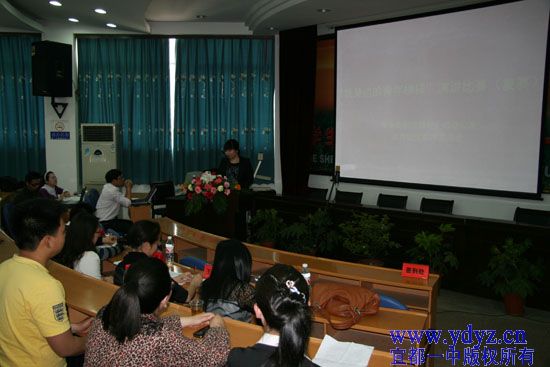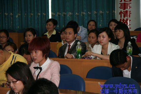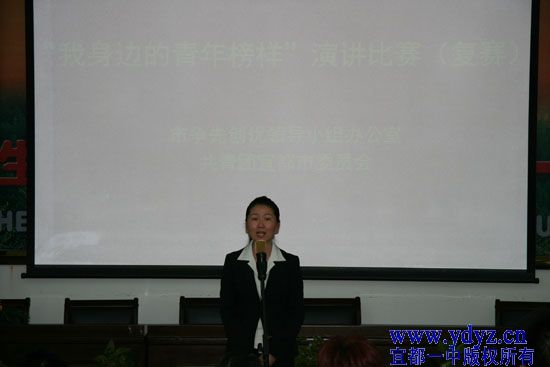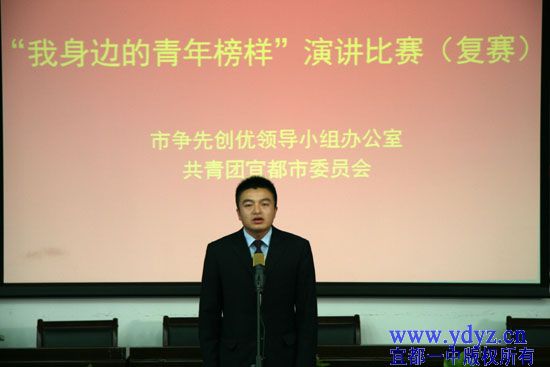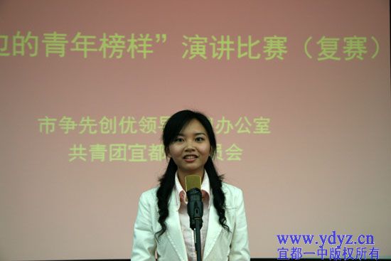 4月18日下午,由共青团宜都市委举办的“我身边的青年榜样”演讲比赛复赛在我校二楼学术报告厅隆重举行。本次比赛特邀共青团宜都市徐纯副书记、市创先争优办吴艳主任、市文化馆王永红主任、以及包括我校政教室主任蔡琼老师在内的专家作为评委。
