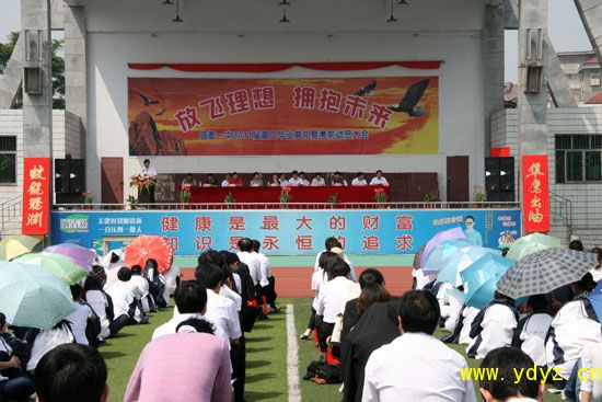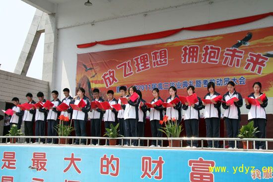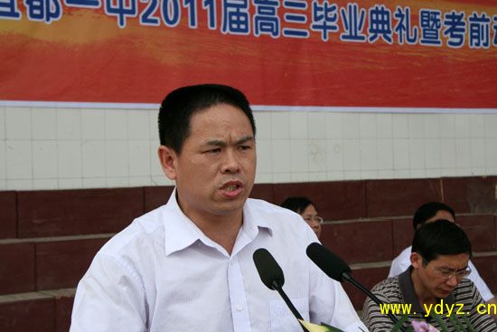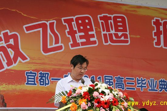 2011年5月6日上午,阳光明媚,万里无云。宜都一中隆重举行了2011届高三毕业典礼暨考前动员大会,高三全体学生和学生家长共同见证这一盛典。宜都市委书记、市人大主任庄光明,宜都市委常委、宣传部长王长镜,宜都市人大副主任曹诗芬,宜都市副市长严永梅,宜都市政协副主席王宏,宜都市教育局长谭国银,共青团宜都市委副书记徐纯,宜都市教育局副局长孙大勇及学校党政班子成员出席了会议。