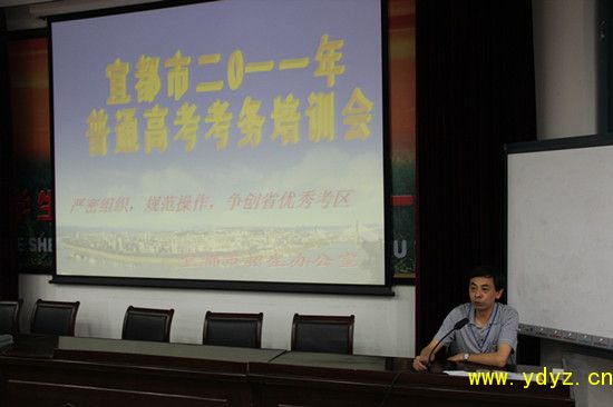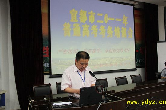 2011年6月6日上午8时,宜都市2011年普通高考考务培训会在我校多功能厅召开。会议由市教育局副局长李从木同志主持,会上市教育局党委副书记江进华同志组织全体监考教师和考务人员学习相关文件,市教育局招考办主任刘珍同志向与会人员详细讲解了高考操作规程以及注意事项。最后,省、市巡视员及市教育局局长谭国银、市政府副市长严永梅同志分别就今年高考提出了相关要求,全面进入高考临战状态。