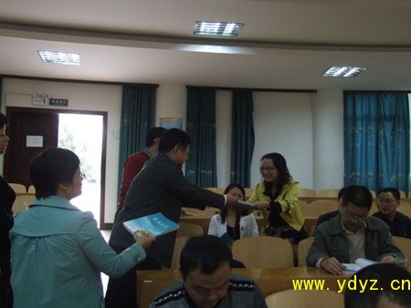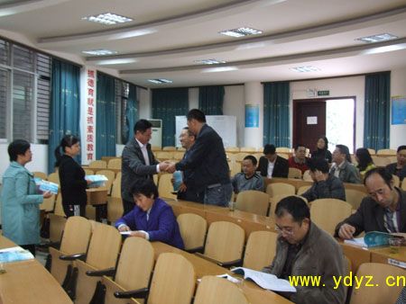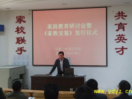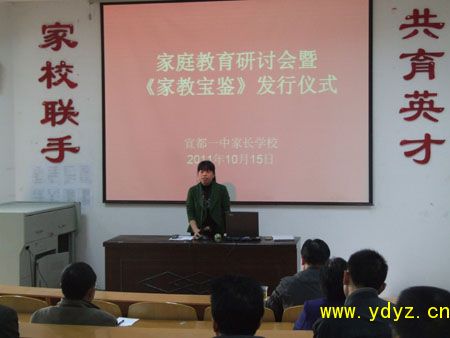 10月15日,宜都一中家长学校培训教室里,副校长何阳平老师向近百名学生家长从赠送了由我校周朴华校长主编、湖北人民出版社正式出版发行的《家教宝鉴》一书。