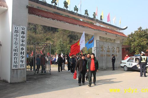 清晨,校园内旌旗招展,华灯闪烁,高二年级全体师生,家长志愿者1000多人在教学楼前整装待发。六时三十分,校长周朴华宣布宜都一中第二届迎新远足正式开始,校旗队雄赳赳走在队伍的最前列,各班成两路纵队向目标地宜都市宋山社会实践活动基地出发,队伍连绵一千多米,一路歌声嘹亮,沿途受到广大群众的驻足欢迎。十点钟队伍到达宋山基地,学生参观了景区景观,德育教育展览,分班举行了盛大联欢活动。下午一点队伍原路返回。