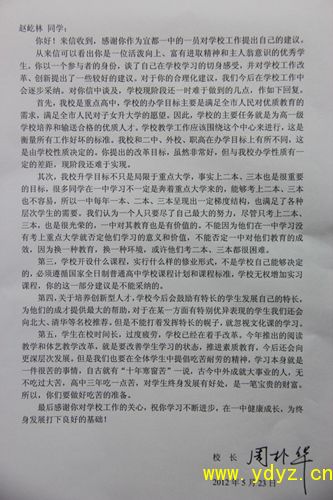 5月22日,校长周朴华收到高二年级一名学生来信,该生对学校发展提出了很多较好的建议和想法。收信后,周校长非常重视,当即给她写了回信,对该生的主人公精神予以充分肯定,并表示今后在学校工作中会逐步采纳她的合理建议。对于学校现阶段还一时难于实现的建议,周校长也耐心答复,提出相应对策。事后,周校长通过多种途径,鼓励学生为学校发展献计献策,要求学校管理干部和全体教师重视学生意见,加强与学生的沟通,共建和谐校园。