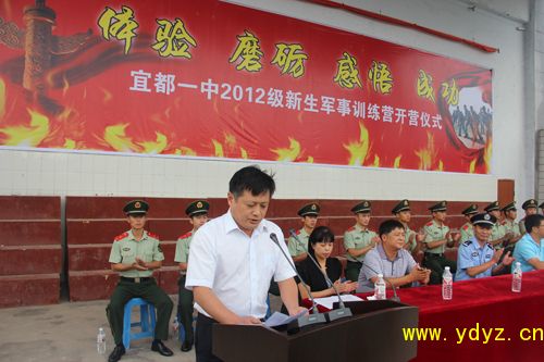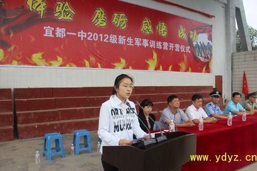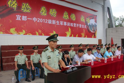 8月23日上午8时,我校在后操场举行了2012级新生军训开营仪式,来自武警宜昌支队第四大队的15名教官、学校领导班子成员、高一年级领导小组、全体高一班主任新生及班主任参加了本次的开营仪式,大会由学校政教室主任蔡琼主持。