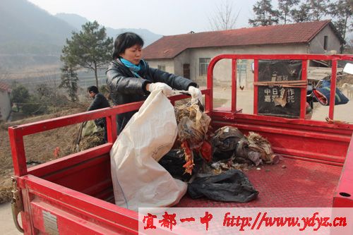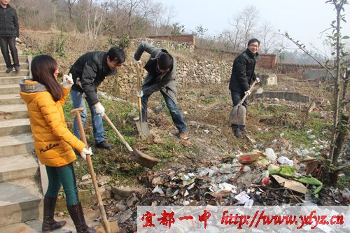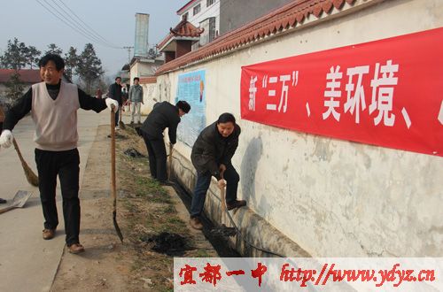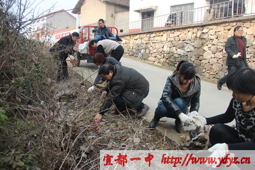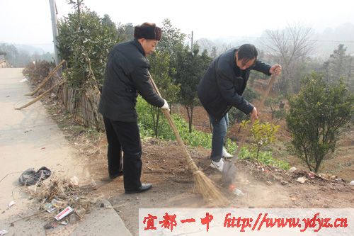 元月10日,宜都市一中17名党员和入党积极分子在学校党委委员程仁新同志、学校“三万”工作组长周振佩同志的率领下,深入“三万”活动驻点村枝城镇五峰山村开展“洁万家”活动,参加义务劳动。