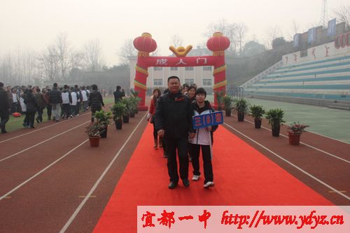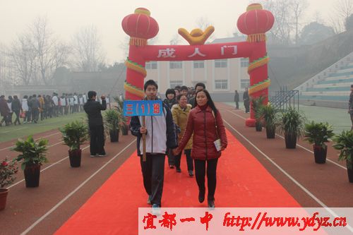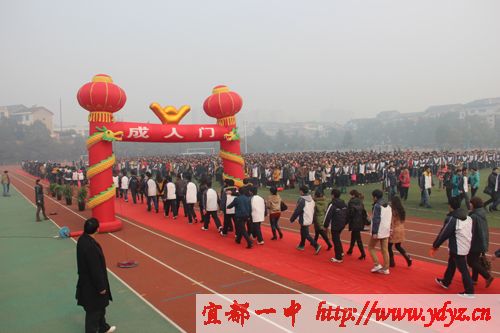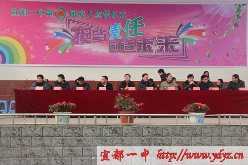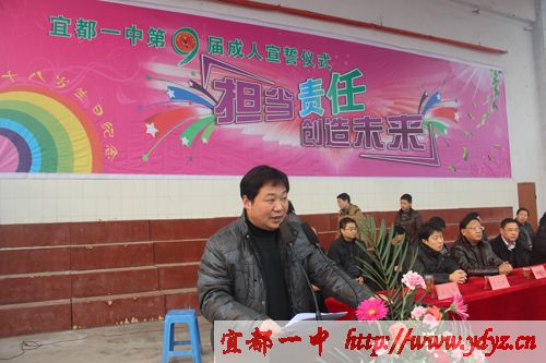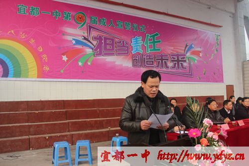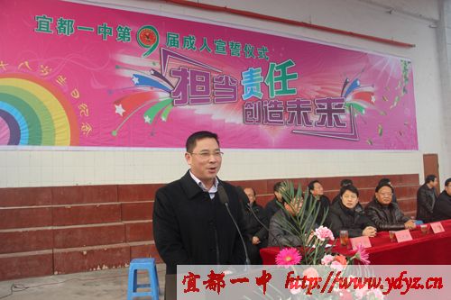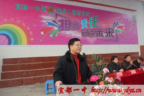 成人仪式在嘹亮的国歌声中拉开序幕,学校党委书记、校长徐振祥同志,家长代表龙顶全同志,教师代表汪文平同志在成人礼仪式上谆谆教导同学们要胸怀大志、成人成才,不忘感恩,回报社会。徐振祥同志亲自为同学们颁发《中华人民共和国宪法》。宜都市教育局局长周朴华同发表了语重心长的讲话,他说:我们既然已经行了成人礼,从现在开始,我们成为了一个完整的中华人民共和国公民,享有与其他人同等的权利,但值得提出的是,我们的身上同样也多了一份责任与义务。激励同学们努力学习,提升自我修养,使自己成为一个有能力履行这份责任和义务的人。让学生顿时感觉肩上的担子重了起来。