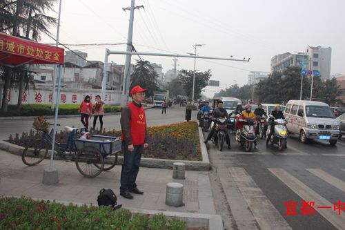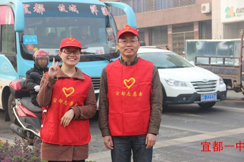 名教职工志愿者,将分七批次为客运站十字路口提供为期一年的交通劝导服务,主要负责劝导行人遵守交通规则,文明出行,平安出行,引导市民共建文明和谐宜都。
