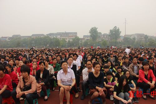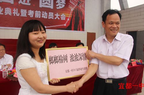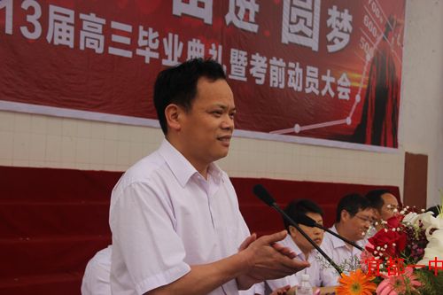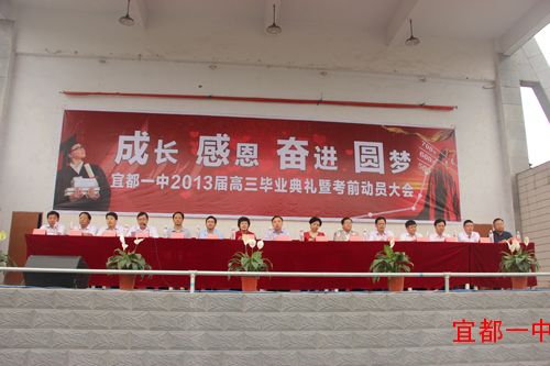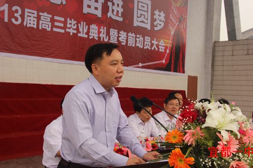 5月5日上午九点,我校在操场上隆重举行2013届高三毕业典礼暨考前动员大会。出席大会的领导有宜都市委常委、宣传部长罗华玉,人大副主任曹诗芬,副市长严永梅,政协副主席谭国银,教育局党委书记局长周朴华、副局长王家良,以及学校班子成员、年级主任、家长代表。
