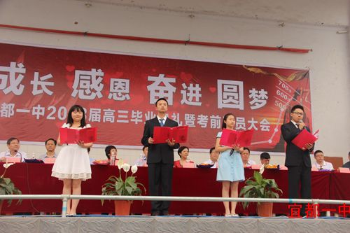 会议由副校长陈云主持,在庄严的国歌声和雄壮的校歌声中拉开大幕,伴随着《感恩的心》的美好旋律,学生代表向辛勤付出的高三老师们献上美丽的鲜花,师生深情拥抱,互致祝福,温馨感人,四位学生代表的诗朗诵《毕业了》表达了对同窗谊,师生情的无比珍惜;年级主任汪文平老师温文儒雅,夫子导学,其乐无穷,大爱无边;校长徐振祥热情勉励,祝福美好未来;宣传部长罗华玉寄语一中学子,让全体学子沉浸在对往日求学的校园生活的美好回忆中,更多地懂得身上肩负的责任,懂得珍惜的含义,明白前方的目标。