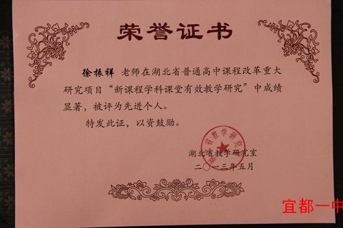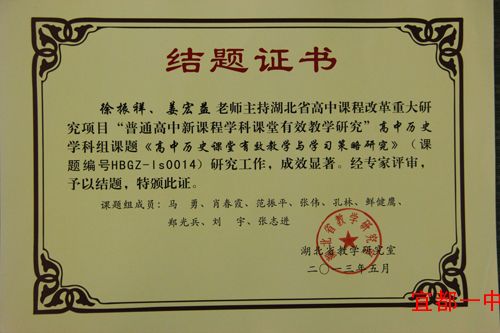 从省教研室传来消息:由我校徐振祥、姜宏益老师主持的,全体历史组老师参与的湖北省高中课程改革重大研究项目“普通高中新课程学科课堂有效教学研究”高中历史学科组课题《高中历史课堂有效教学与学习策略研究》于2013年5月15日在夷陵中学顺利结题。