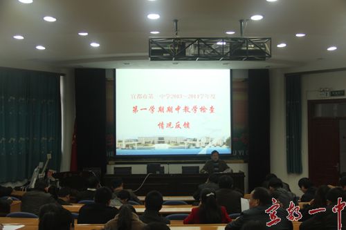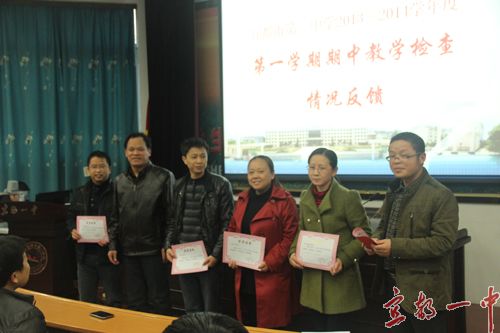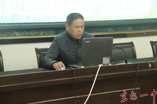 教务室主任邓斌对期中教学工作作了全面总结,包括优秀教案、学案、评教评学、听课等内容,认真分析了我校高一、高二期中考试及高三11月月考的成绩,从各班平均分、各班各科各档次的人数进行了分析,并且针对存在的同一学科不同班级的平均分差距大、同一人数段内不同班级的人数差距大、同一档次中各班的人数差距大这三方面的问题提出了全体教师要关注学生的学习状态,督促学生形成良好的学习习惯、继续关注不同层次学生的发展,促进不同层面学生的进步等相应的措施。针对各年级不同的特点分别提出了不同的具体要求,并对学校下一步教学工作重点作了指导,要求全体教师努力拼搏,建设独具我校特色的教学文化,促进学生多元化发展。
