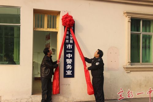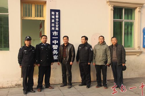 2013年12月11日下午,我校又多了一张“安全网”——校园警务室正式挂牌,宜都市公安局、陆城派出所领导,我校校长徐振祥共同为宜都一中校园警务室成立揭牌。陆城 派出所负责人全面阐述了在学校设立校园警务室的重要性和必要性,希望宜都一中全校师生深化警民合作、加强警校联动,努力营造良好的学习、生活和工作环境,确保学校正常教学、生活秩序。我校校长徐振祥代表全校师生郑重承诺:学校将认真贯彻落实上级的指示精神,全力做好学校的安全保卫工作,加强日常巡逻执勤。