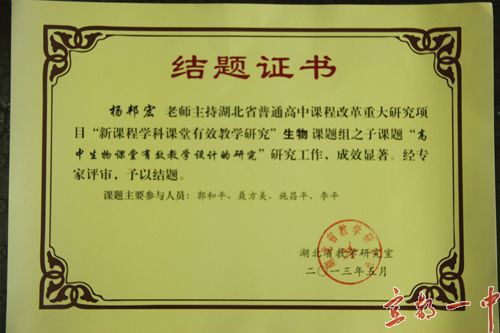 在本次成果展示及研讨活动中,生物教研组组长杨邦宏在会上做结题发言,受到了与会代表的普遍好评。杨邦宏、聂方美、李平、郭和平、施昌平老师被评为湖北省课题研究先进个人。