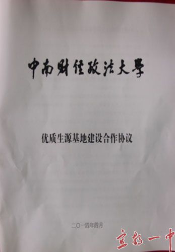 我校与中南财经政法大学签订了 “优质生源基地”建设协议。根据协议,我校在中南财经政法大学高考第一顺序志愿报考的毕业生和达到自主招生选拔条件的毕业生,同等条件下享有优先录取。