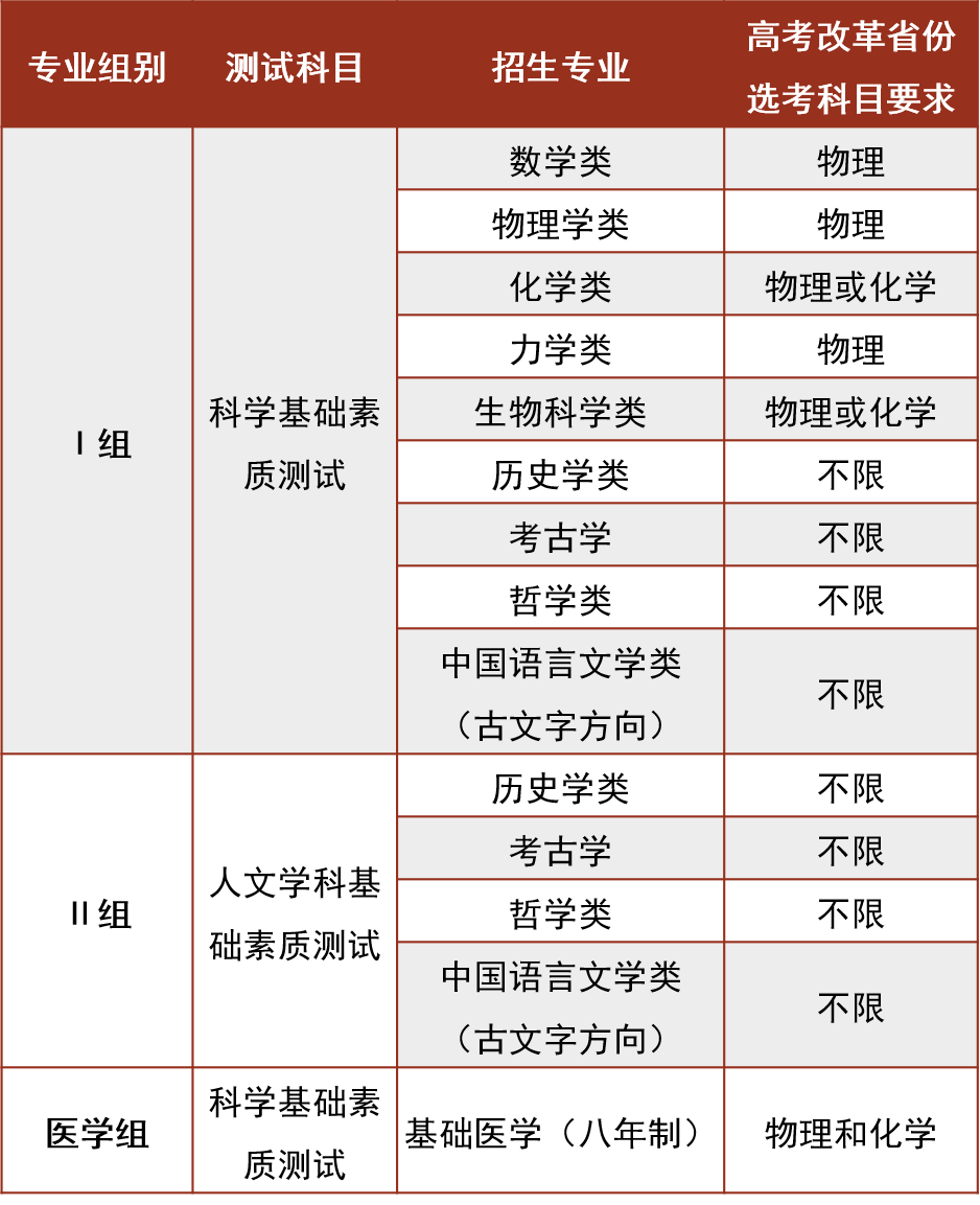 1. 学科基础素质测试:传统高考省份:Ⅰ组和医学组测试内容为数学、物理、化学,Ⅱ组测试内容为语文、历史、政治;高考综合改革省份:Ⅰ组和医学组测试内容为数学、物理,Ⅱ组测试内容为语文、历史。
